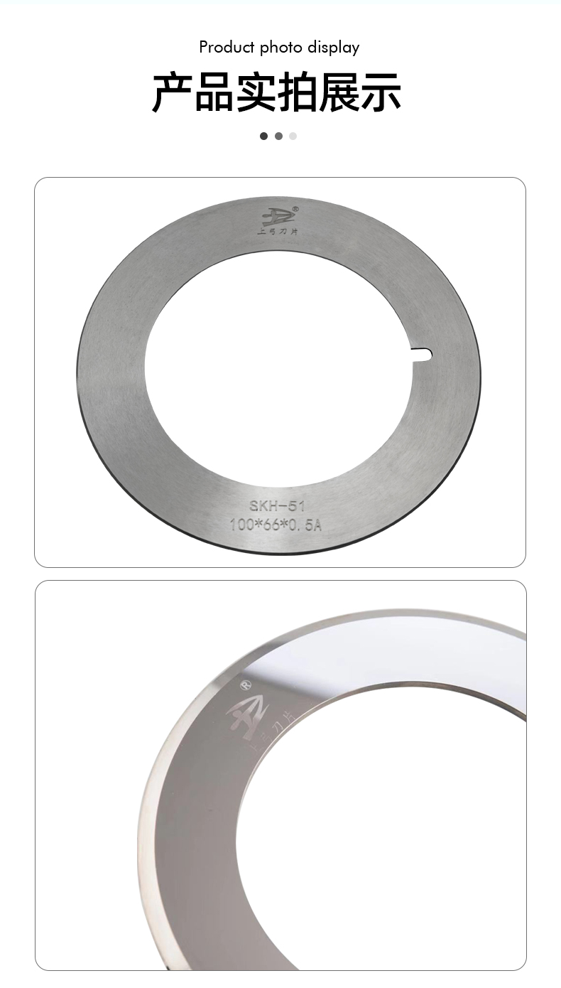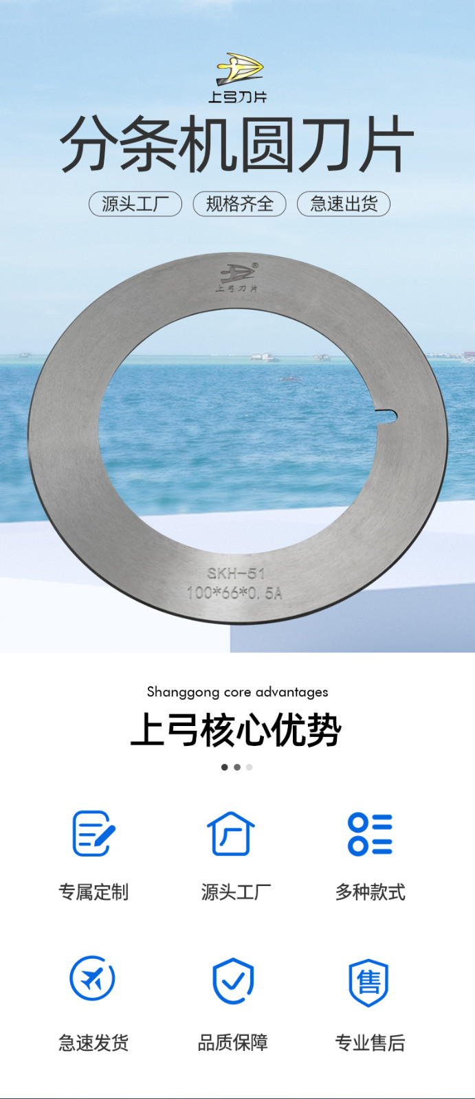 本公司生產的分條機上下刀廣泛用于紙類、塑膠薄膜類、布類、發泡類泡棉、橡膠類、金屬銅鋁箔、石墨烯材料的分切加工。此類產品經過專業的設備磨削加工而成。產品具有外觀好,精度高,換刀頻次少,壽命長,具有極高的性價比。